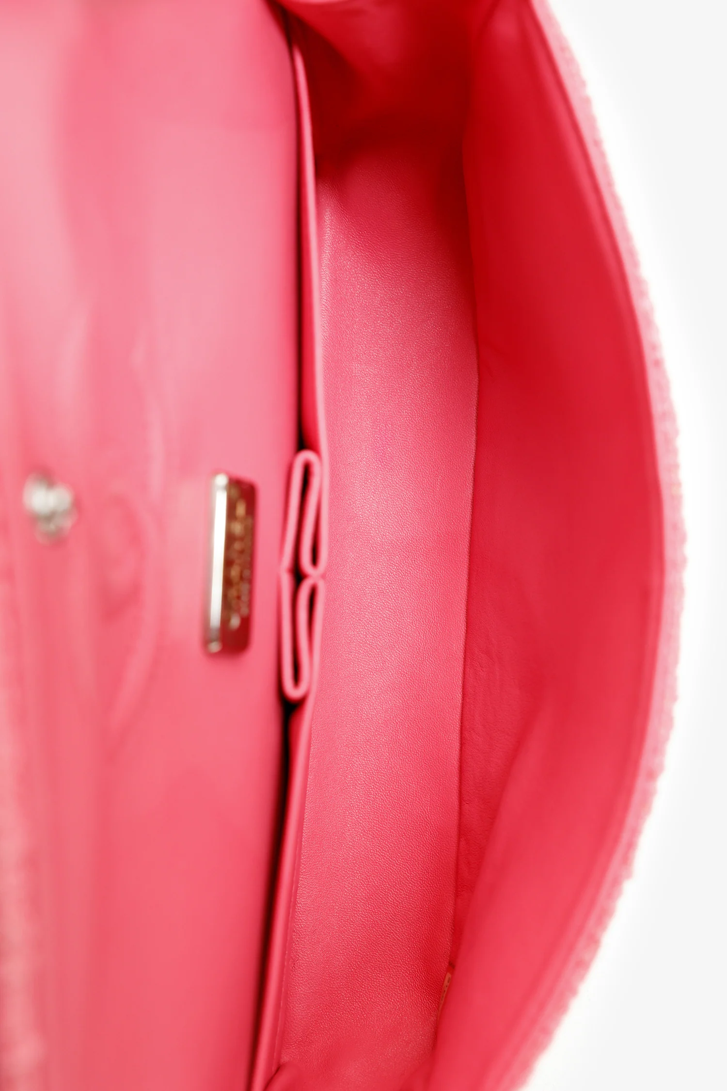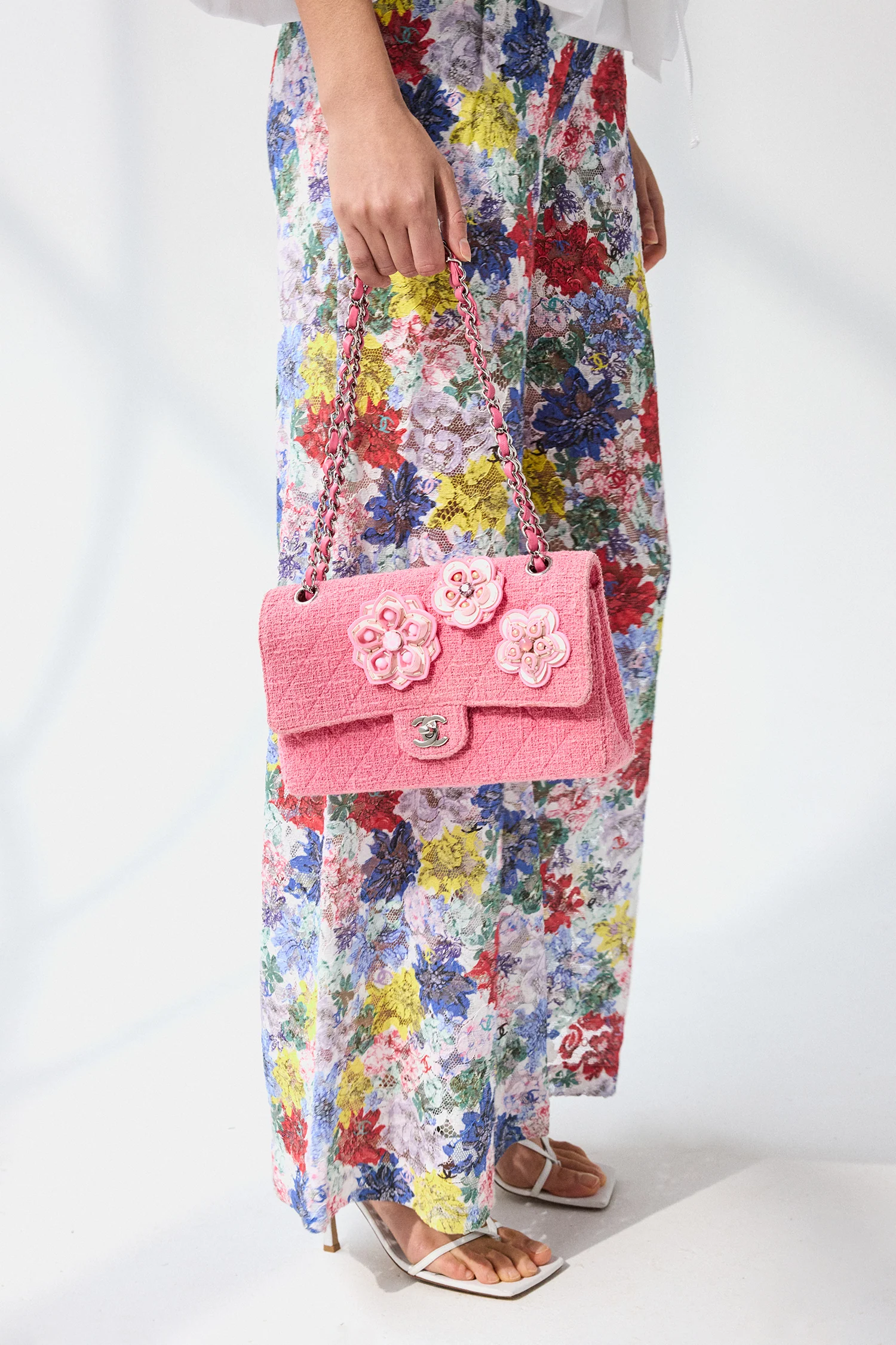 Refresh availabilityPre-Loved Chanel™ 2016 Pink Tweed Flower Classic Double Medium Flap Bag. Front fold-over flap with turn-lock closure. Twin chainlink straps that can be pulled into one long strap. Single exterior rear slip pocket. Leather-lined interior. 2 interior compartments; front compartment with 1 large open pocket. 2 interior slip pockets with single lipstick compartment. Back compartment with 1 zip pocket on underside of top fold-over flap. Silver-tone hardware. Tonal stitching.