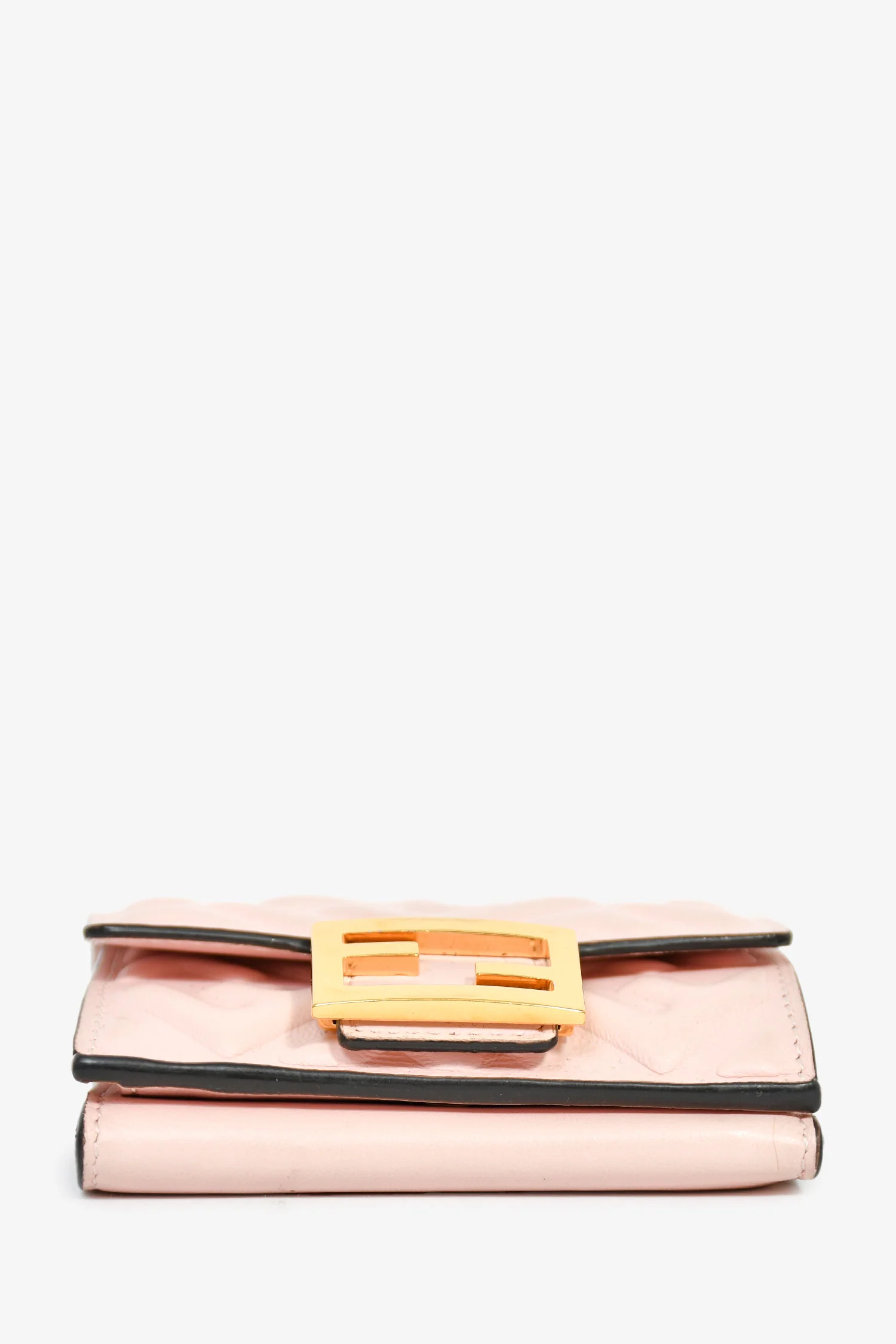 Refresh availabilityFendi Pink FF Baguette Compact Wallet. 1 front and 1 rear fold-over flap with snap closures. 5 compartments: 1 coin pocket, 1 bill and 3 card slots. Gold-tone hardware. Tonal stitching.