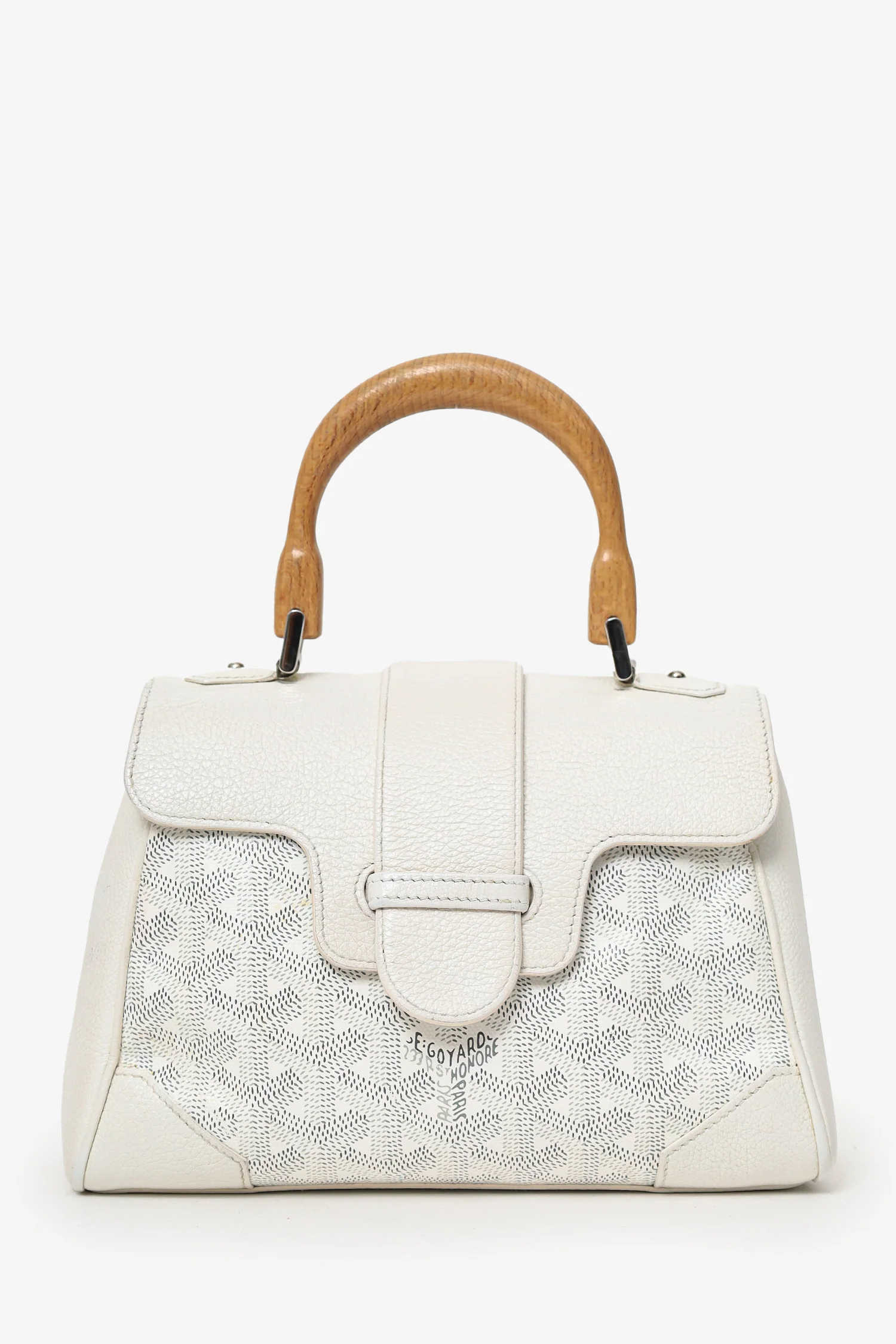 Refresh availabilityGoyard Cream Goyardine Mini Saigon Bag With Strap. Front fold-over flap with pull-through closure. Wooden top handle. Removable crossbody strap with adjustable push-pin closure. Leather-lined interior. Single interior slip pocket. Silver-tone hardware. Tonal stitching.