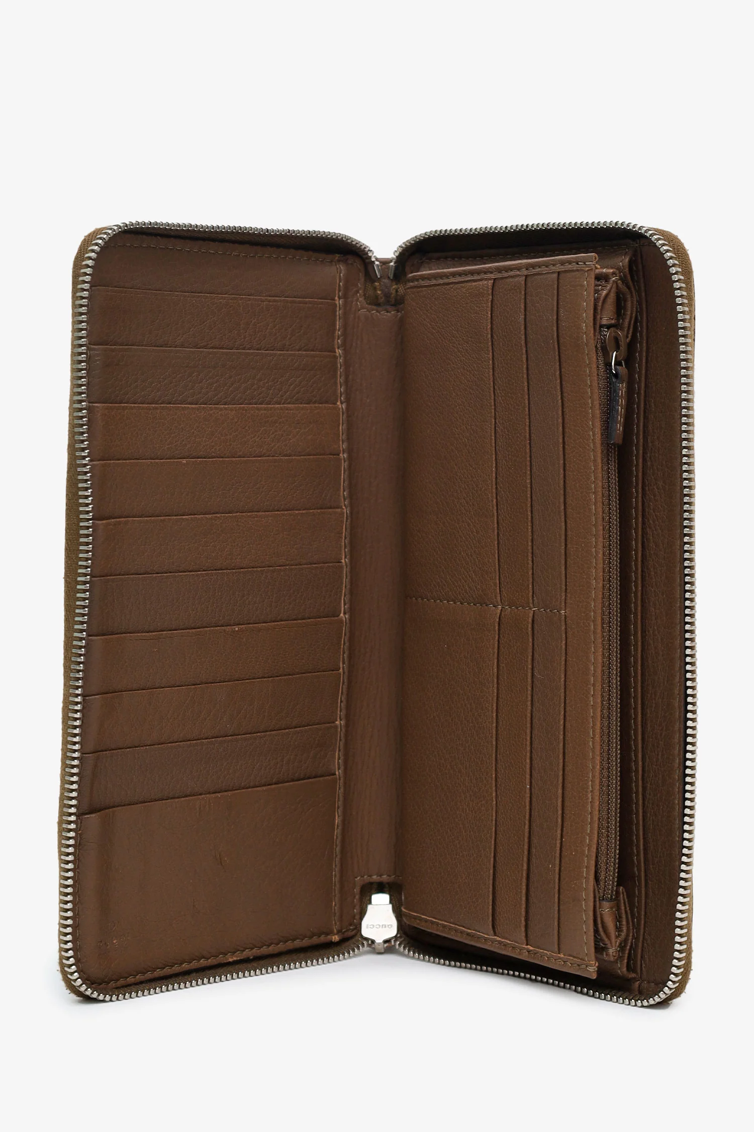 Gucci Brown Leather Interlocking G Soho Zippy Wallet. Top zip closure. Leather-lined interior with 21 pockets; 16 card slots, 4 bill slots, 1 zip. Silver-tone hardware. Tonal stitching.