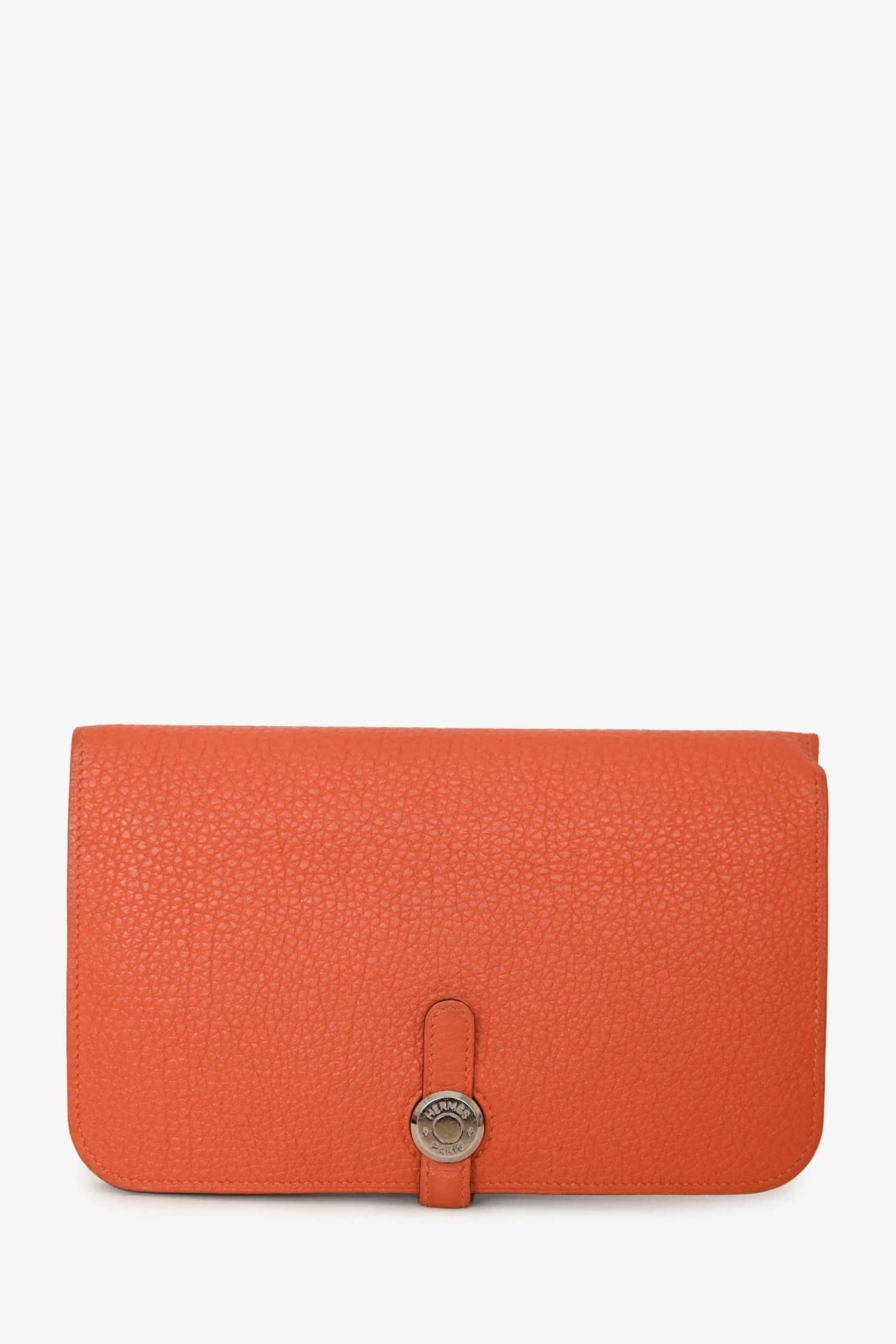 Hermès Orange Togo Leather Dogon Wallet. Flap closure with leather tab and toggle fastening. 2 interior compartments; 5 interior slip pockets. Silver-tone hardware. Tonal stitching.
