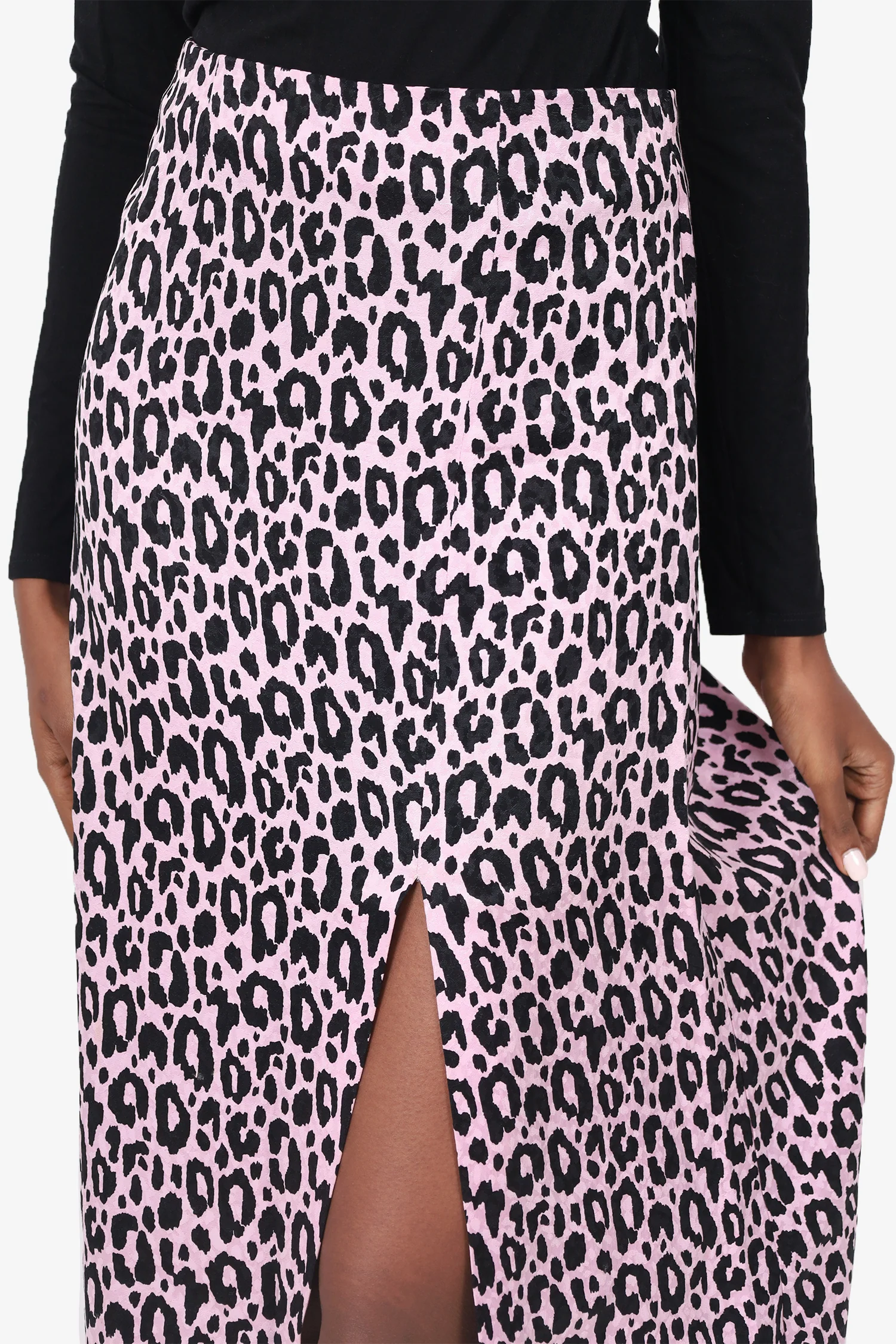 Maje Pink/Black Satin Leopard Print Skirt size 36. Slip-on. Rear zip closure. Side-slit. Tonal stitching.