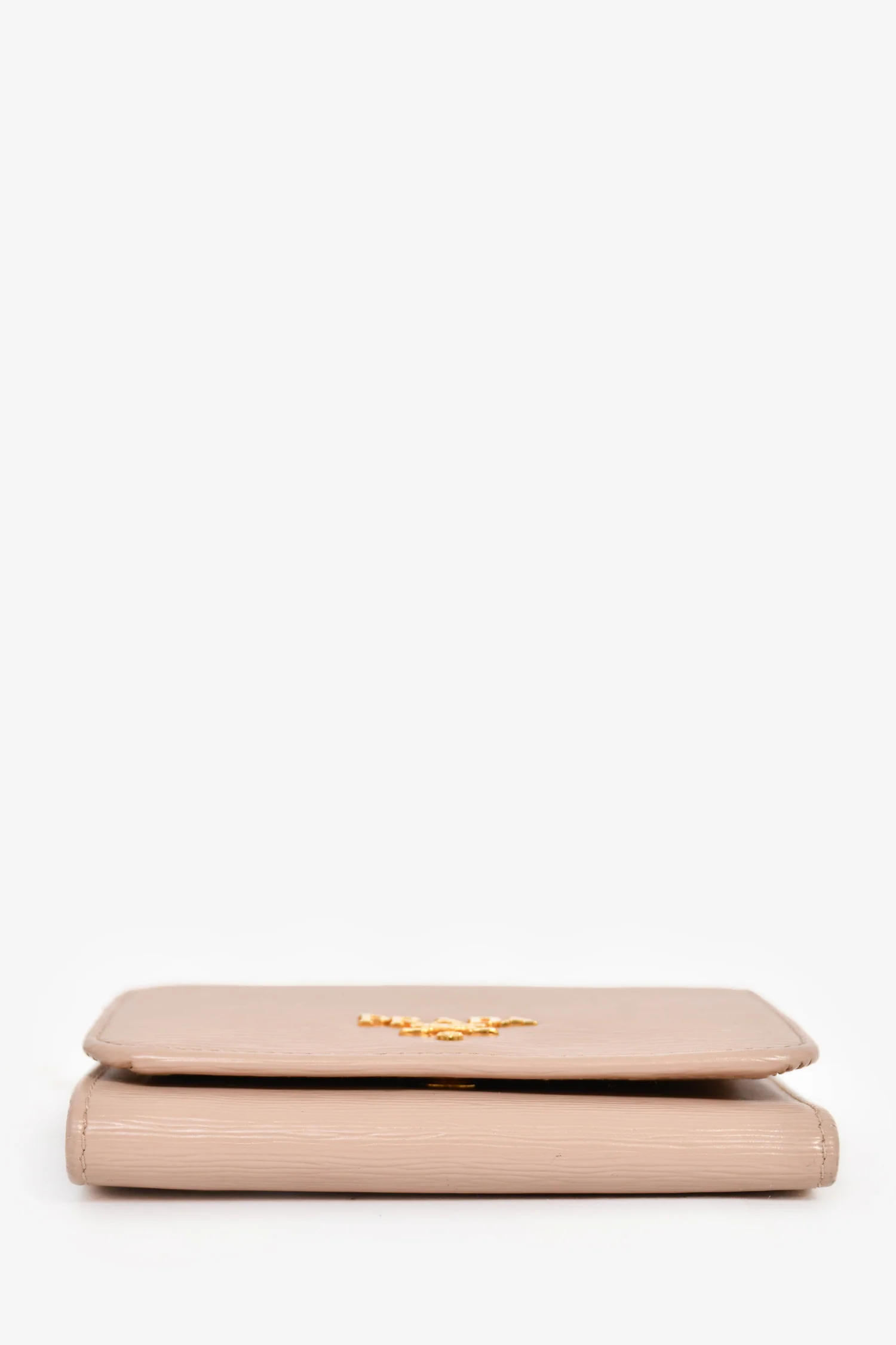 Refresh availabilityPrada Pink Leather Logo Small Wallet. Fold-over flap with a snap closure. 1 bill compartment, 10 card slots, and 1 coin pouch. Gold-tone hardware. Tonal stitching.