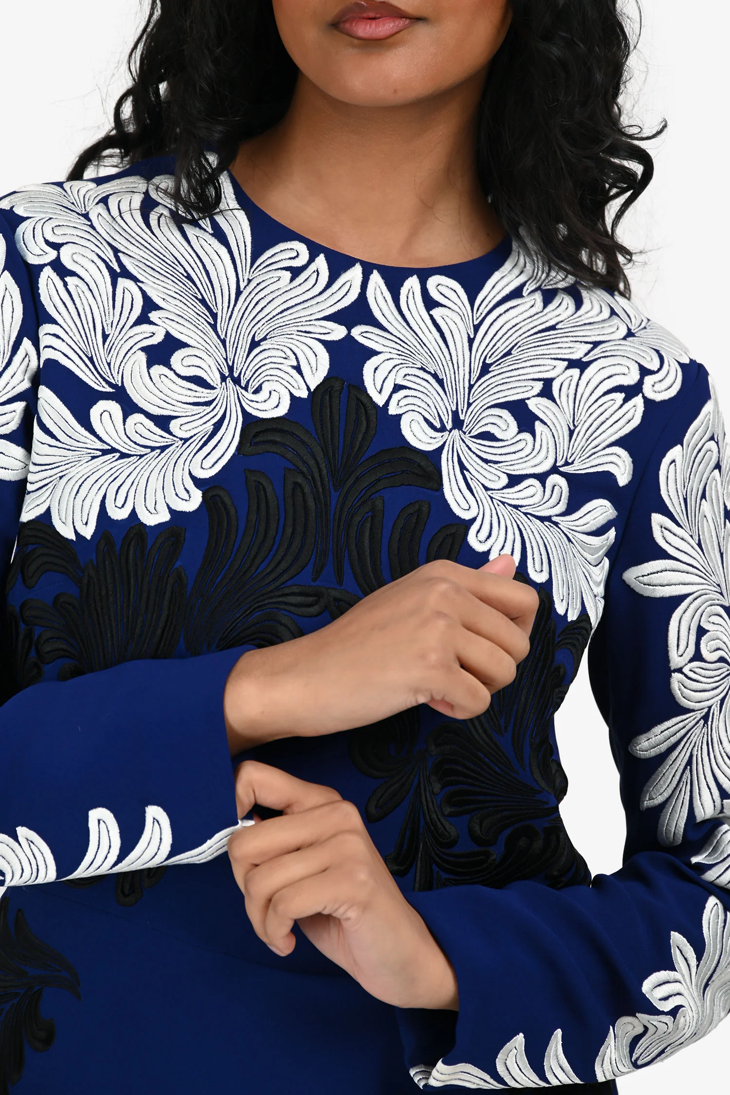 Refresh availabilityStella McCartney Blue/White Embroidered Long Sleeve Top. Round neckline. Hidden zipper with hook-and-eye closure in the rear. Tonal hardware. Tonal stitching.