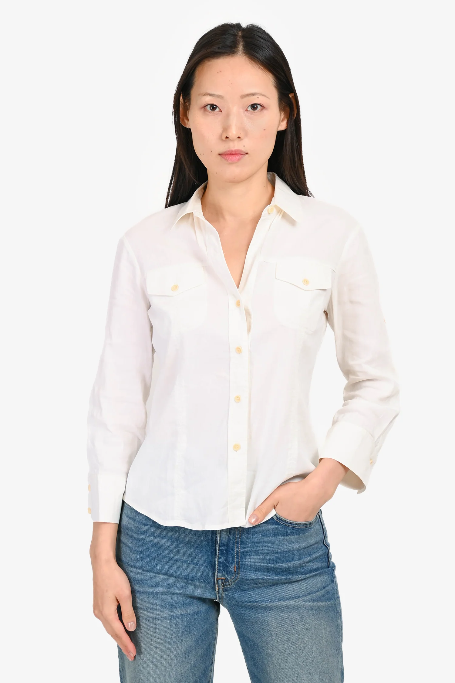 Refresh availabilityTheory White Collared Button Down Top. 2 patch pockets with button closures. Button placket on the cuff. Button detailing on the sleeve for adjustability. Tonal stitching.