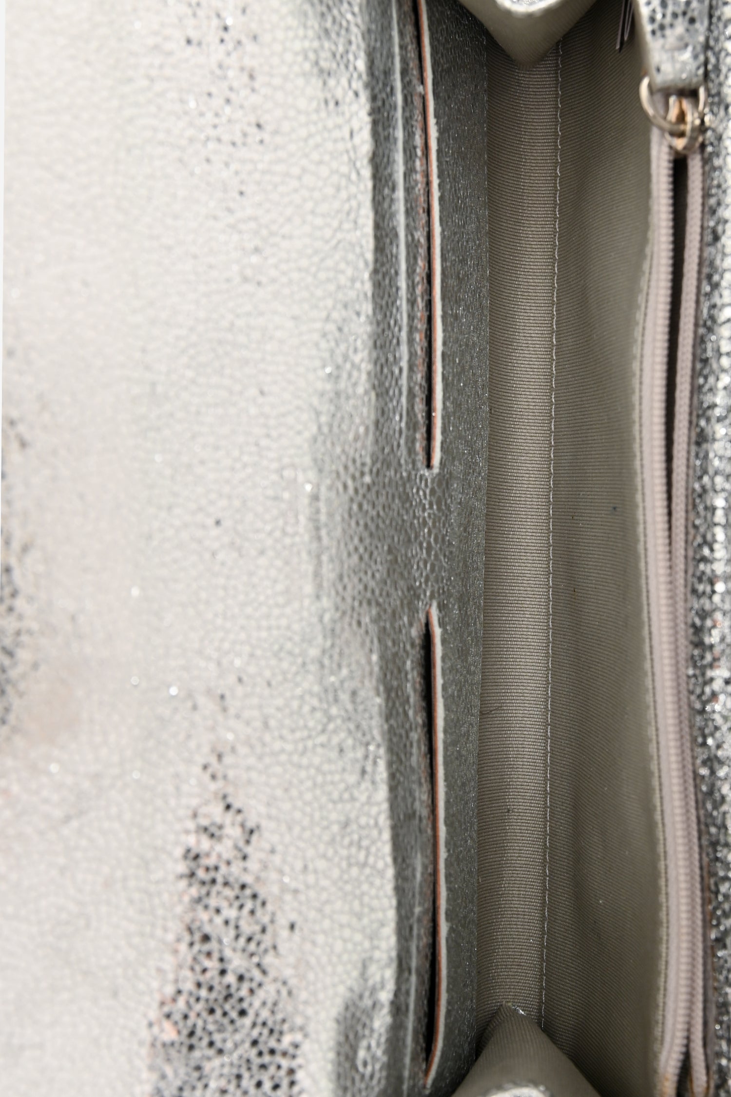 Refresh availabilityJimmy Choo Silver Metallic Bow Embellished Evening Shoulder Bag. Front fold-over flap with magnetic button closure. Textile-lined interior. 3 interior pockets; 2 slip card slots, 1 with zip closure. Silver-tone hardware. Tonal stitching.
